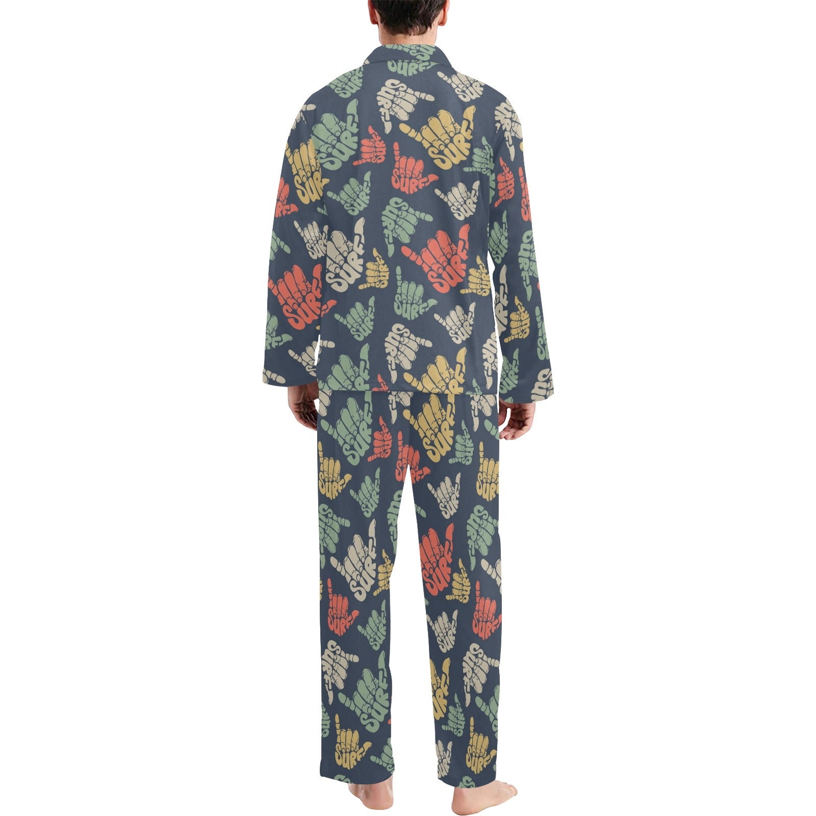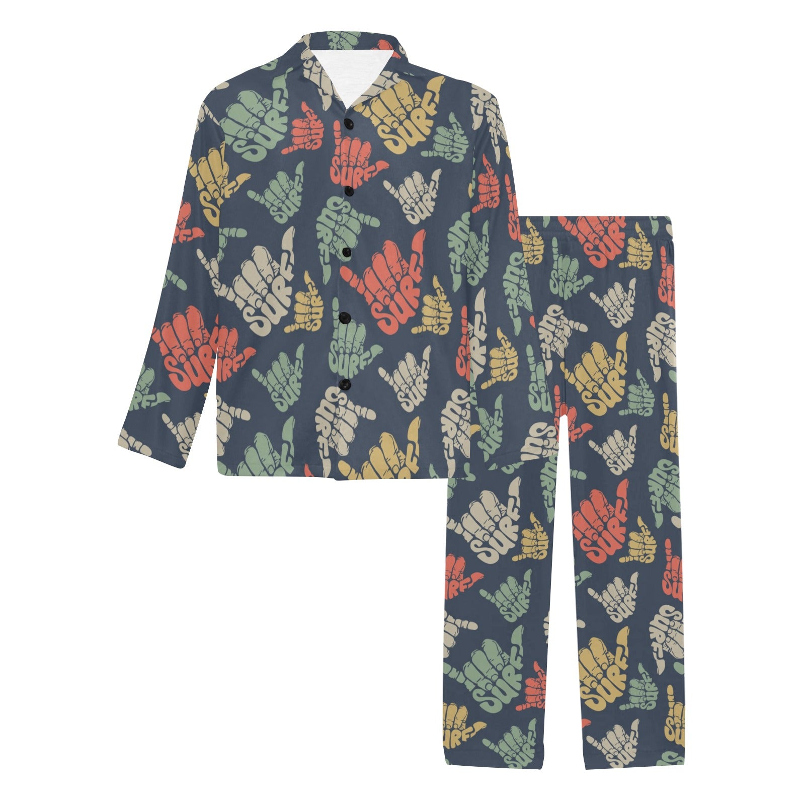 Surf Hand sign Men's Long Pajama Set Made to Order Item. It is hand-cut and sewn just for your order! This process starts as soon as your order is placed and may have a processing time of 5-9 business days before it ships.