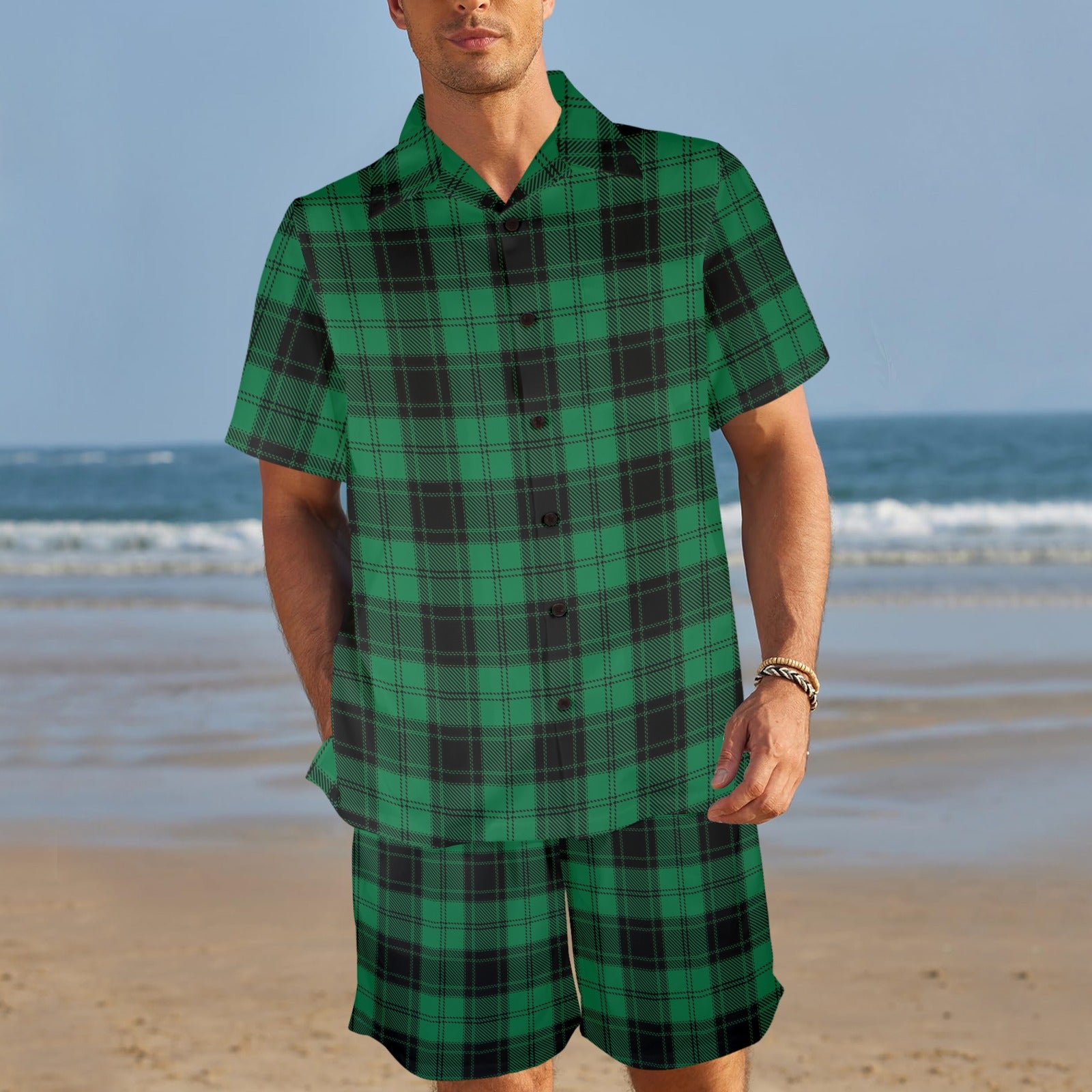 Tartan Green Print Design LKS302 Men's Beach Shirt and Shorts Set