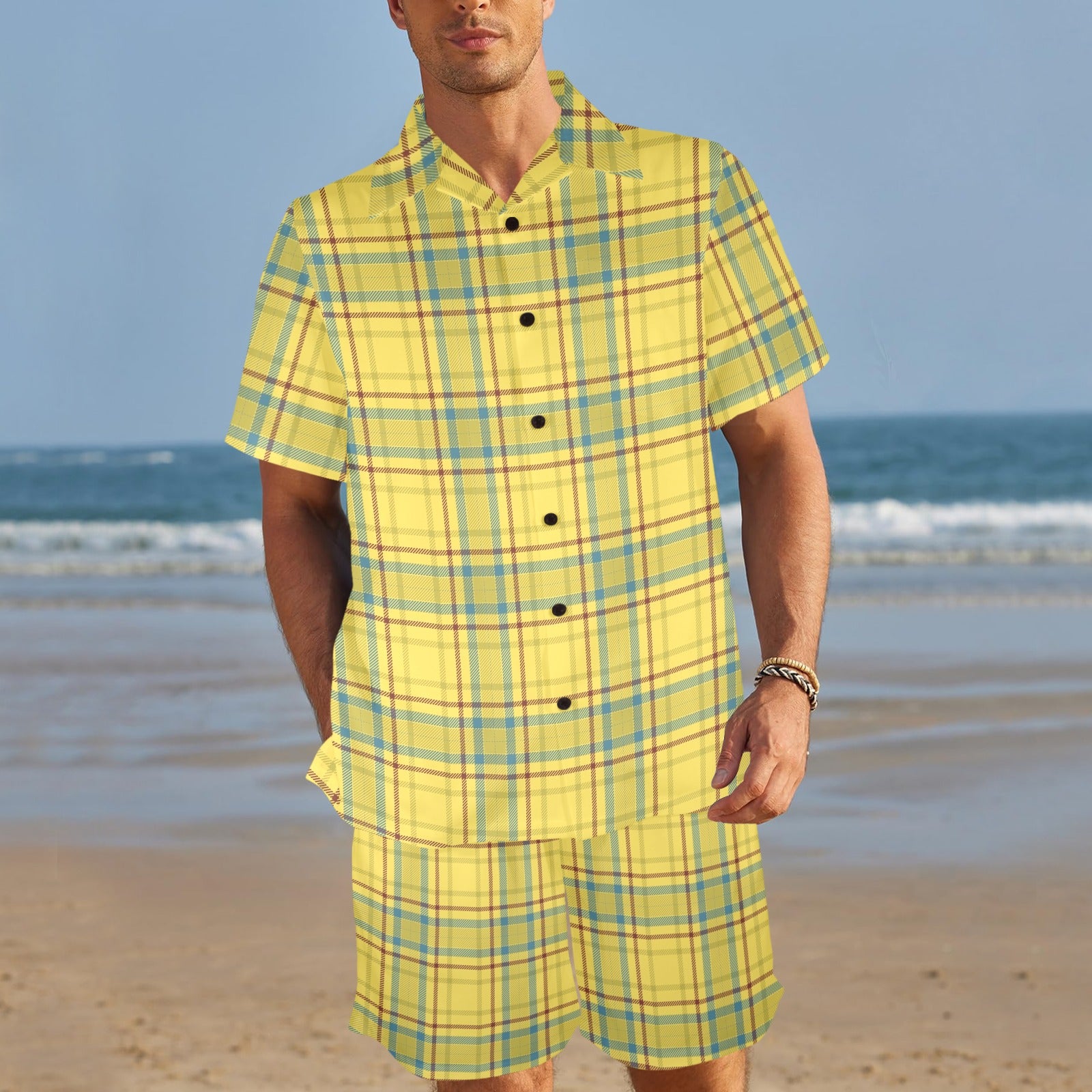 Tartan Yellow Print Design LKS301 Men's Beach Shirt and Shorts Set
