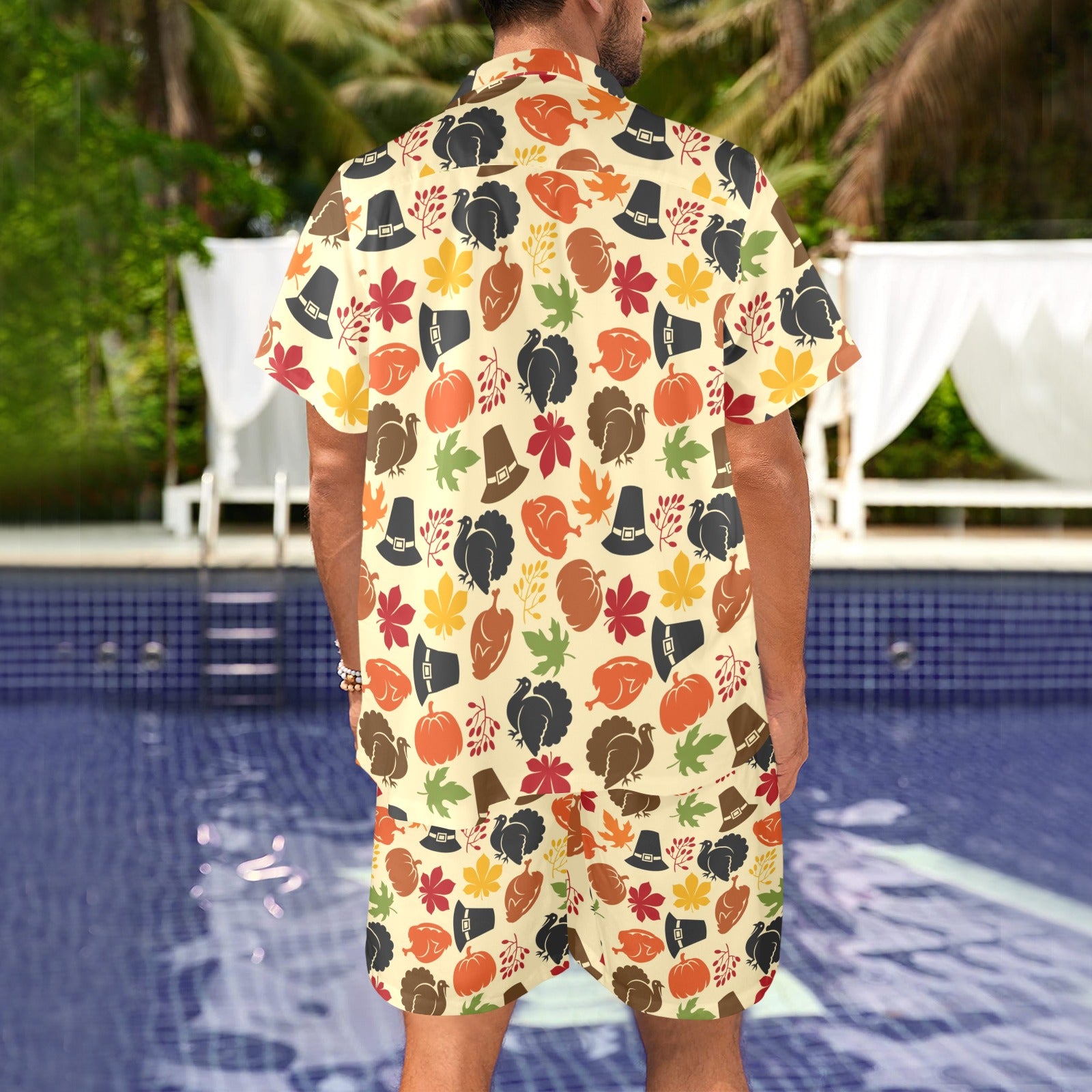 Thanksgiving Print Design LKS303 Men's Beach Shirt and Shorts Set. It is hand-cut and sewn just for your order! This process starts as soon as your order is placed and may have a processing time of 5-9 business days before it ships.