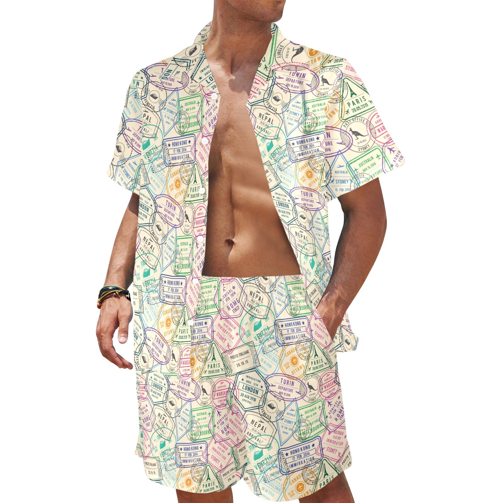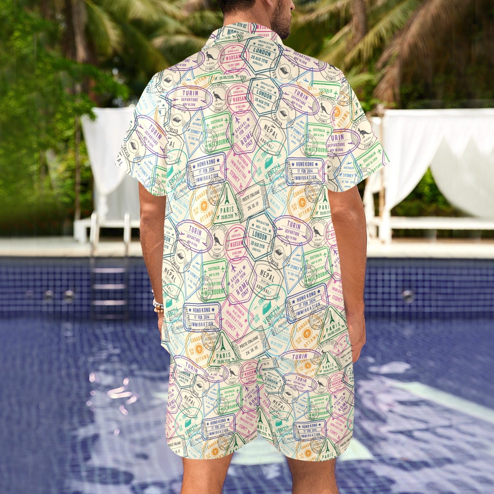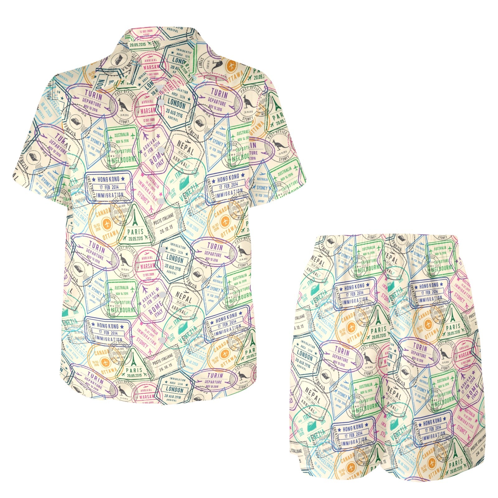 Travel Stamp Print Design LKS303 Men's Beach Shirt and Shorts Set. It is hand-cut and sewn just for your order! This process starts as soon as your order is placed and may have a processing time of 5-9 business days before it ships.
