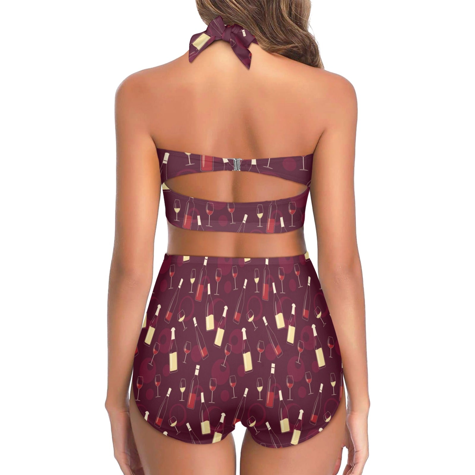 Wine Themed Pattern Print Halter Neck Bikini Swimsuit